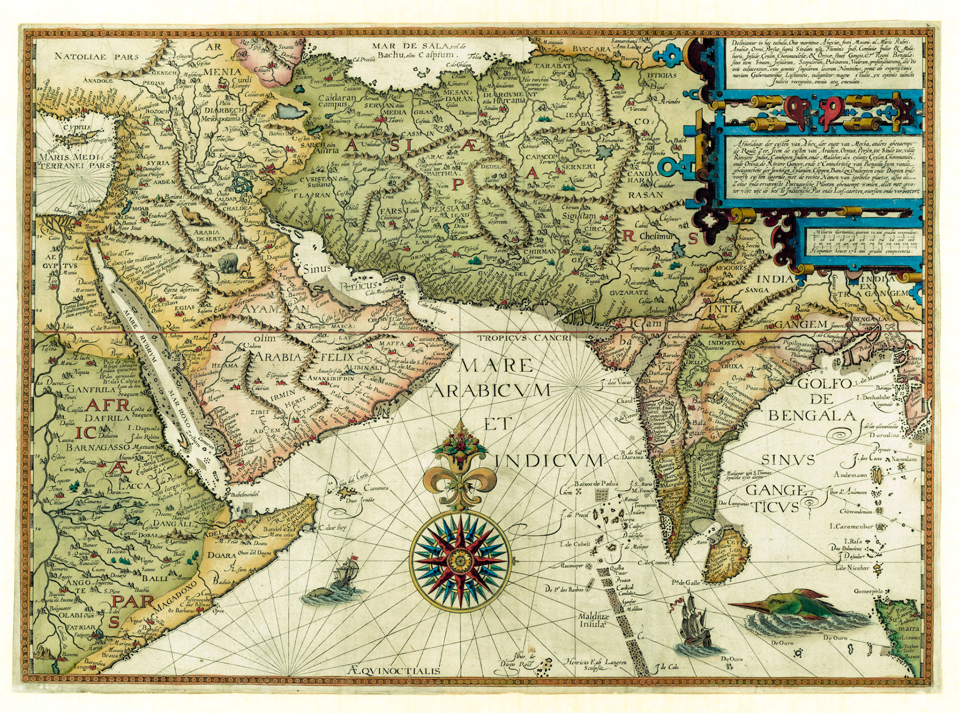 The map is centered on the Arabian Sea with Bengal in the east. The coastal outline of this 420 year old map looks almost like a modern map, unlike other maps of this period. The map is decorated in a lavish style with an exquisitely detailed compass rose, sailing ships, sea monsters and exotic animals. The quality of the engravings is a testament to the mastery of Dutch cartographers and engravers.