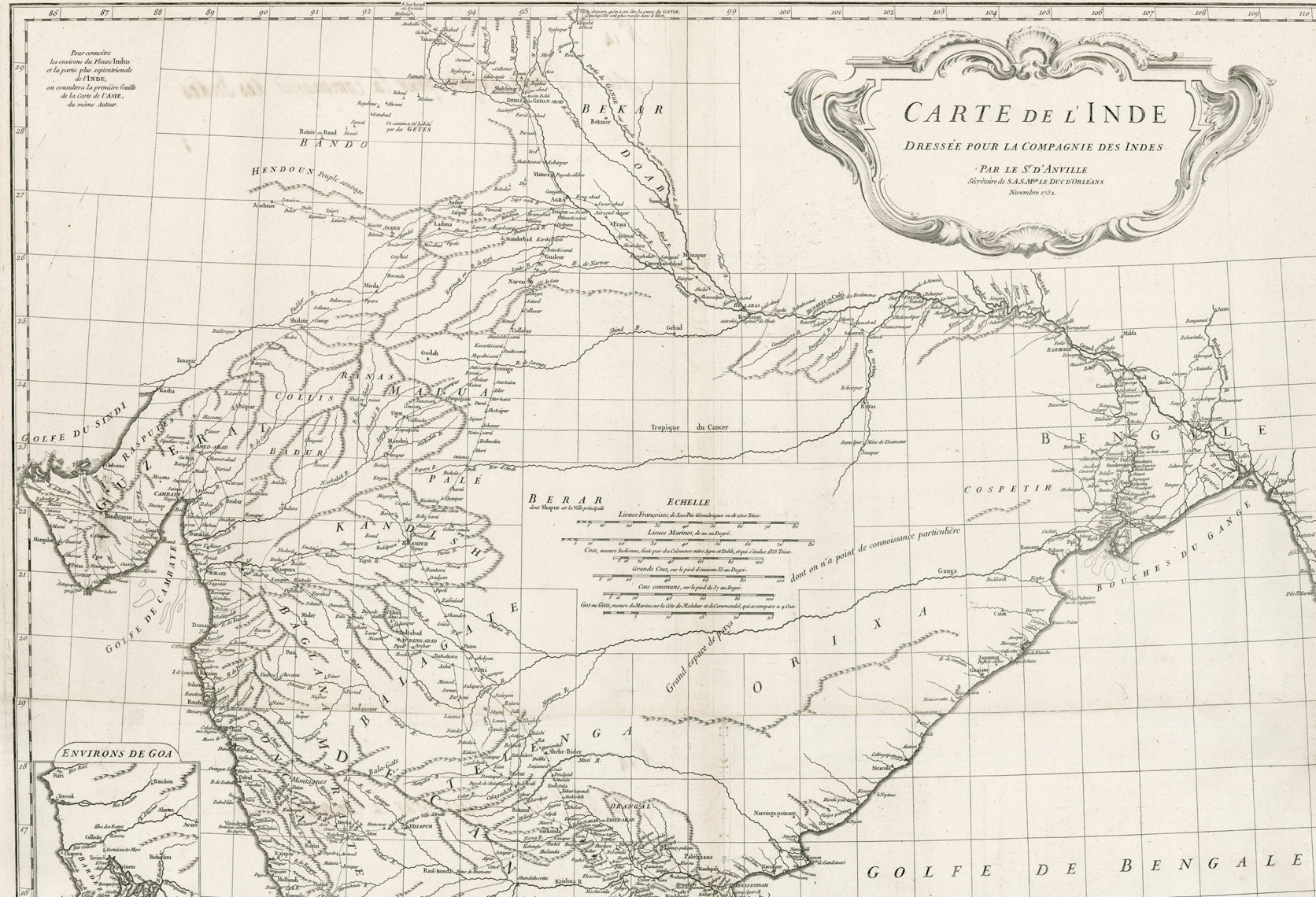 D’Anville’s attention to detail can be appreciated as he outlines the coordinates of the French settlement of Chandannagar : “…The latitude of Shandernagor, observed at the church in the fort, is 22o 51' 32”, and by a great number of observations to determine the longitude; father Boudier concludes its difference from Paris, 5 hours, 44 min. 25 sec. which gives 86o 5 or 6'. In the Philosophical Transactions of the Royal Society, for the year 1733, by an observation of an eclipse of the moon, on the 20th of December, 1732, O.S. M. Godin makes it 5 hours, 44 min. 37 sec. or 86o 9' ; and in a determination of longitude, the difference of a few minutes of a degree cannot easily be avoided.”