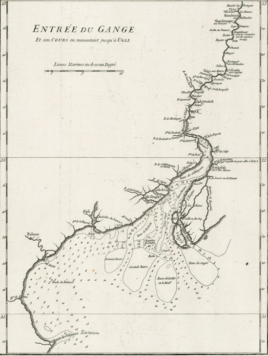 Here D’Anville describes the stretch of the Hooghly river between the city of Hugli and the English settlement of Calcutta: “Ugli is a ſortress of the Moors: By the word Moors here, I mean Mahometans, who govern the country, different from the natives or Indians. The latitude of Ugli, given by father Boudier, is 22o 56' North. This place being the most considerable in the country, the Europeans, who go up the Ganges, have given the lower part thereof the name of Ugli River, and the settlements built by them, to secure their trade, are situated along that river: That of the Portugueze, which they called Bandel, by adopting the Persian word Bender, which signifies a port, is now almost reduced to nothing, having been formerly very considerable, and is a little above Ugli. Just below Ugli is the Dutch settlement of Shinshura, next to that Shandernagor, a French settlement; then the Danish factory; and lower down, on the opposite shore, which is on the left hand going down, Bankibazar, where the Ostenders sometime had a factory and last of all Colicotta, belonging to the English, some leagues below Bankibazar, on the same side of the river.”