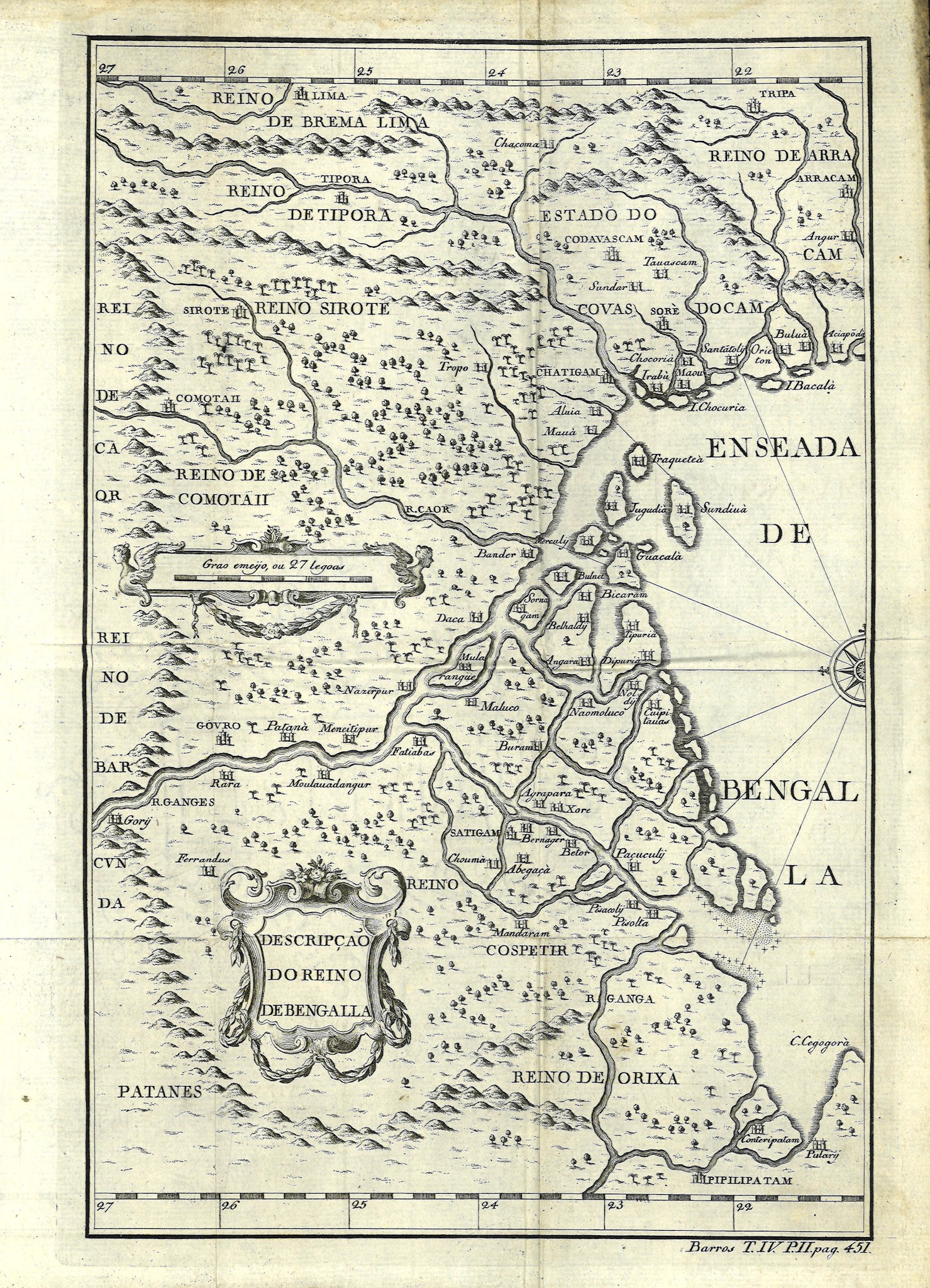 Descripcao do Reino de Bengalla is a foundational map of Bengal because of its level of detail. This map served as the template for future European maps of the region and no major changes were to be made for over a century. In looking at this map one must appreciate the difficulties faced by the cartographer where no surveys or astronomical observations of coordinates were made, distances and directions were only approximations and information was sometimes totally erroneous.